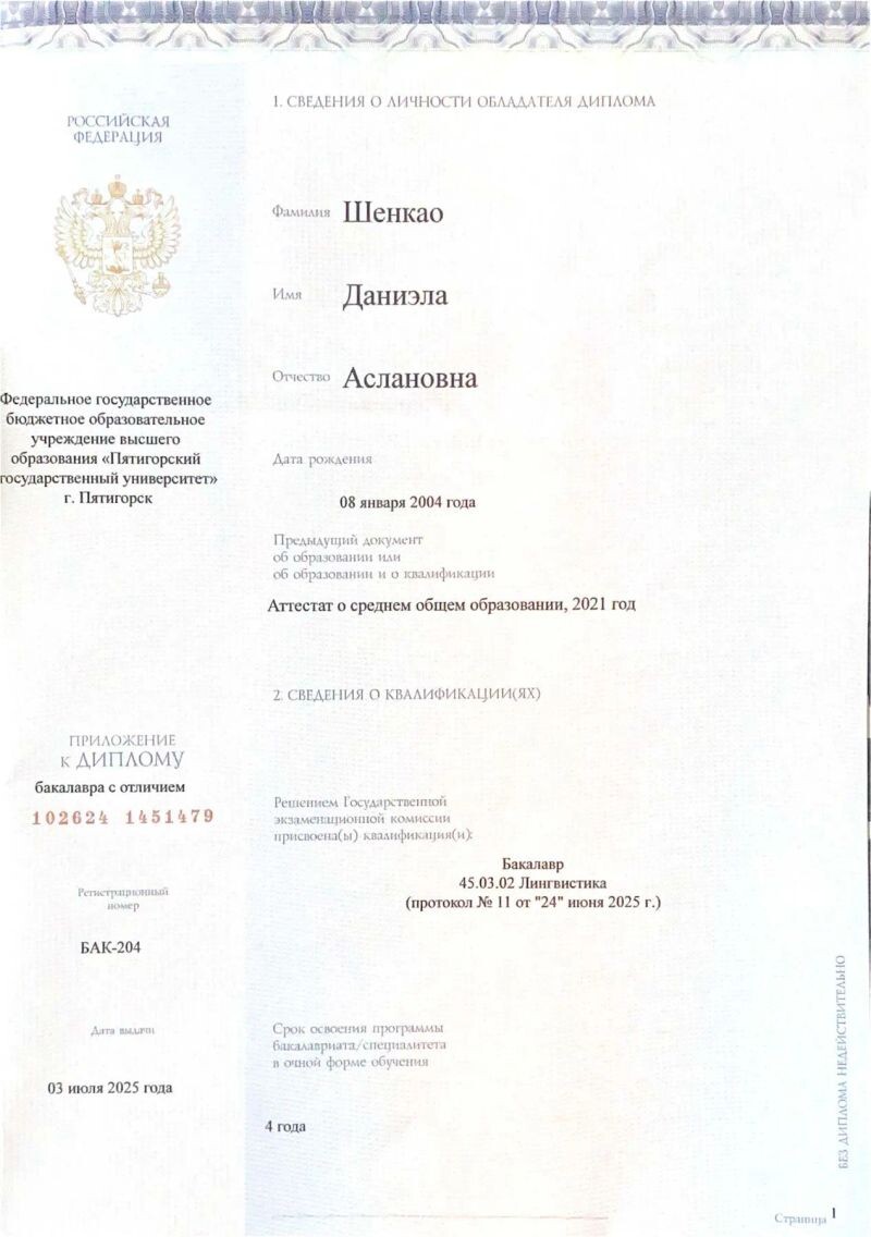 - ФГБОУ ВО "Пятигорский государственный университет", институт переводоведения, русистики и многоязычия. Направление Лингвистика: перевод и переводоведение (китайский и английский языки), 2021–2025 гг.