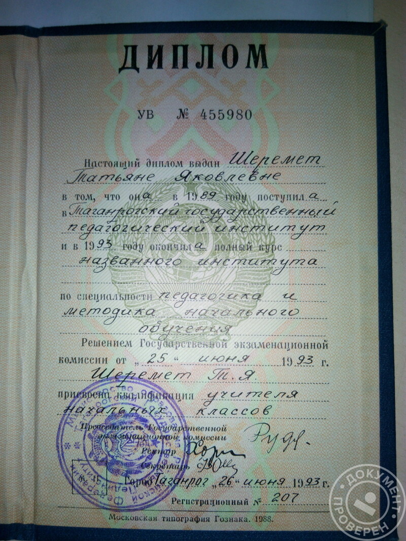 - Таганрогский государственный педагогический институт, факультет педагогики и методики начального обучения, специальность – учитель начальных классов, 1989–1993 гг.