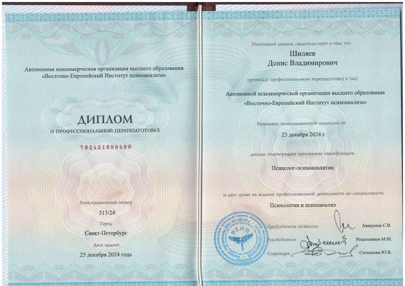 - Восточно-Европейский Институт психоанализа, психолог-психоаналитик, 2023–2024 гг.
