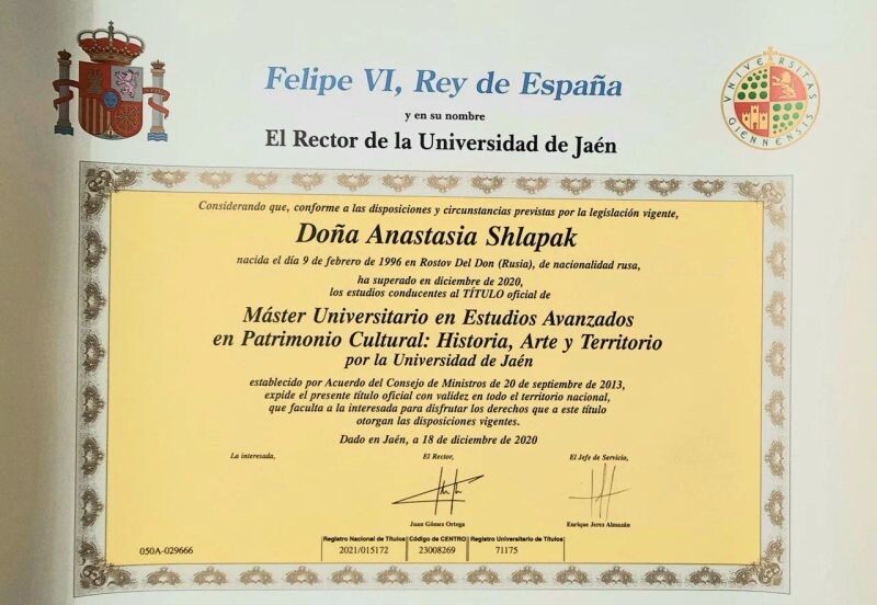 - Обучение в магистратуре в Испании по специальности: Углубленное изучение культурного наследия: История, Искусство, География, 2019–2020 гг.