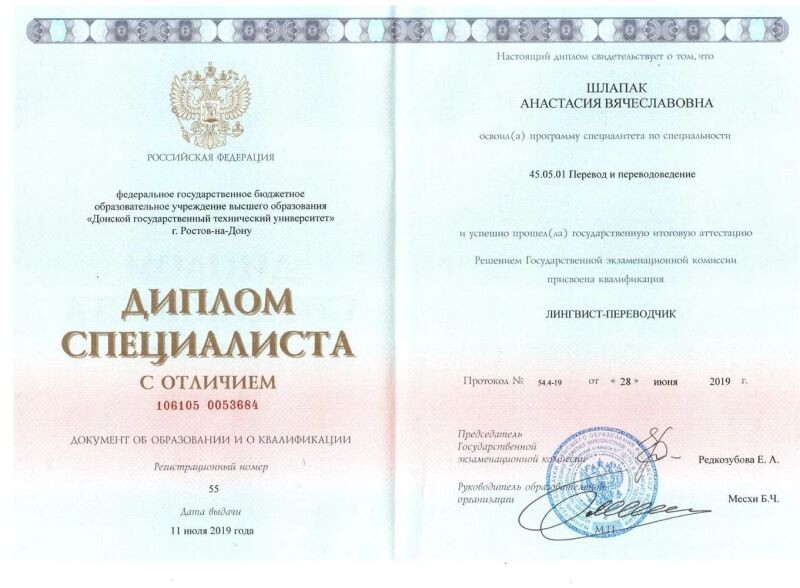 - Донской государственный технический университет, социально-гуманитарный факультет, специальность – перевод и переводоведение, 2014–2019 гг.