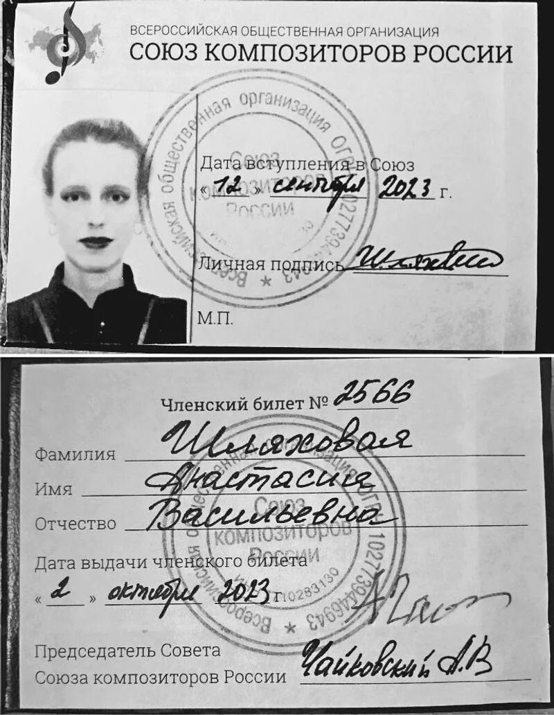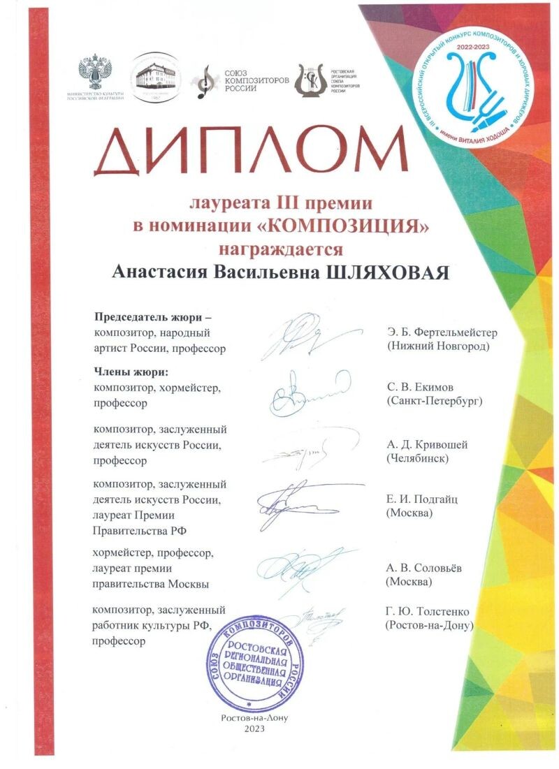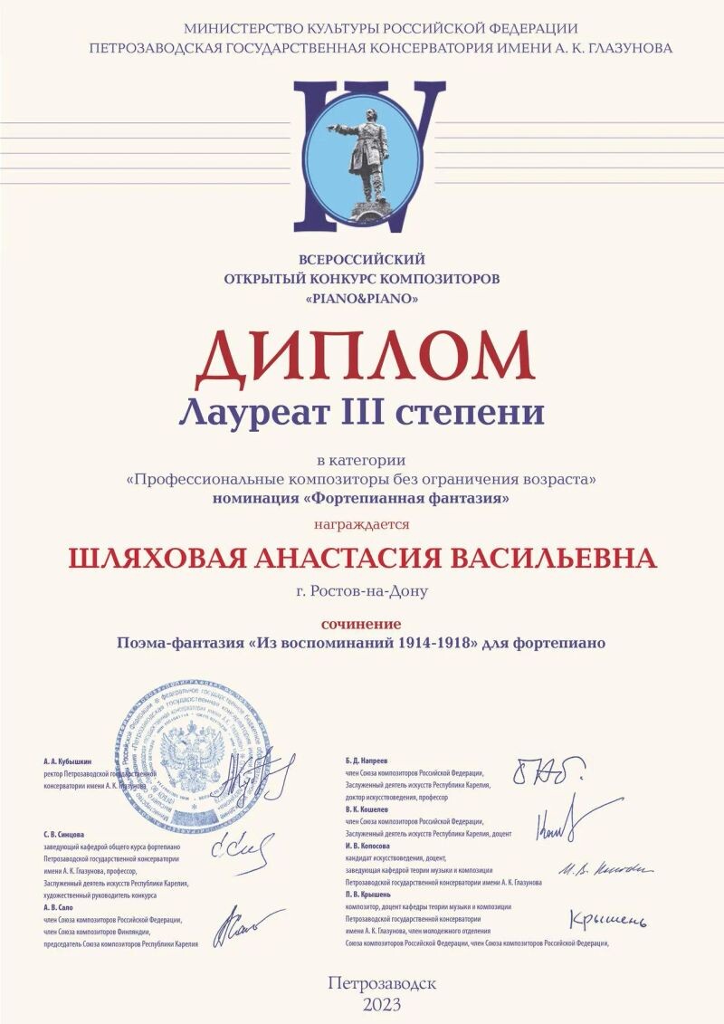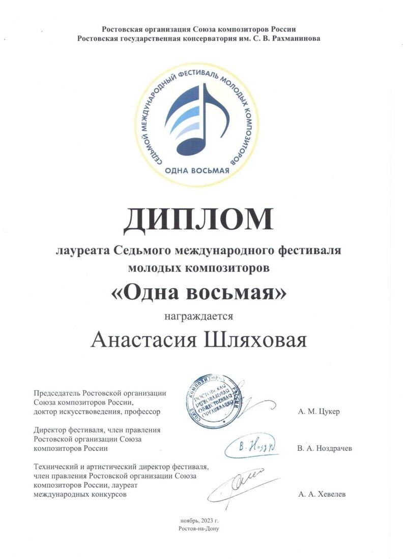 - Ростовская государственная консерватория им. С. В. Рахманинова Ростовская организация Союза композиторов России АНО «Сотворчество», лауреат Седьмого международного фестиваля молодых композиторов «Одна восьмая», 2023 г.