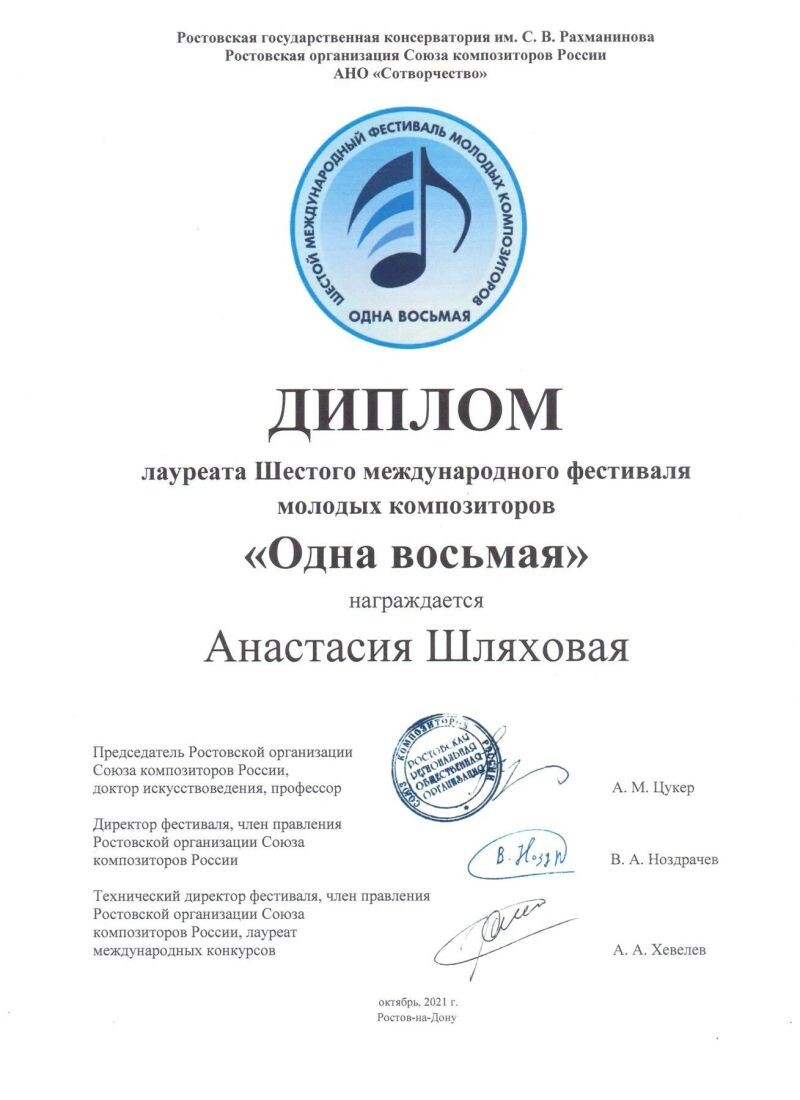 - Ростовская государственная консерватория им. С. В. Рахманинова Ростовская организация Союза композиторов России АНО «Сотворчество», лауреат Шестого международного фестиваля молодых композиторов «Одна восьмая», 2021 г.