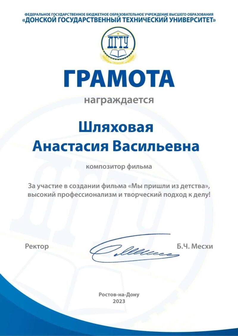 - Федеральное государственное бюджетное образовательное учреждение высшего образования «Донской государственный технический университет», грамота за участие в создании фильма «Мы пришли из детства», высокий профессионализм и творческий подход к делу!, 2023 г.