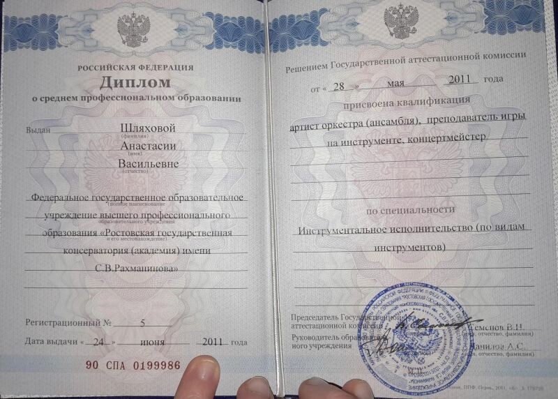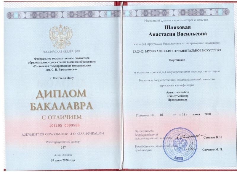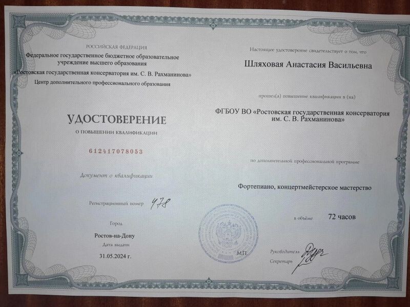 - Ростовская государственная консерватория им. С.В. Рахманинова, фортепиано, концертмейстерское мастерство, 2024 г.