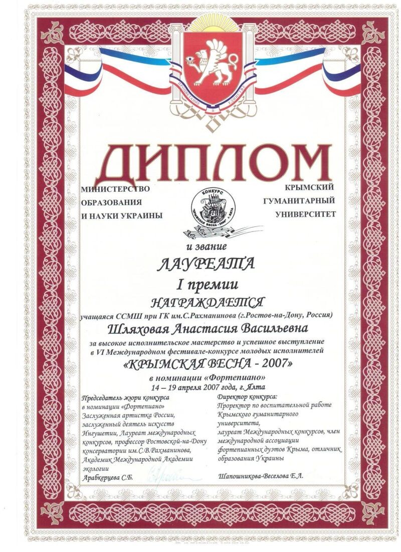 - Лауреат I премии VI Международного фестиваля-конкурса молодых исполнителей «Крымская весна – 2007» в номинации «Фортепиано».