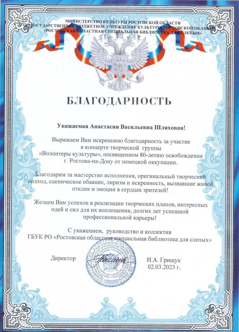 - Министерство культуры ростовской области государственное бюджетное учреждение культуры «Ростовская областная специальная библиотека для слепых», благодарность за участие в концерте творческой группы «Волонтеры культуры», посвященном 80-летию освобожден, 2023 г.