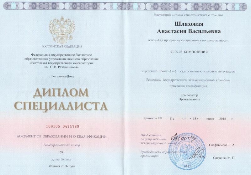 - Ростовская государственная консерватория им. С. В. Рахманинова, квалификация «Композитор, преподаватель.», 2011–2016 гг.