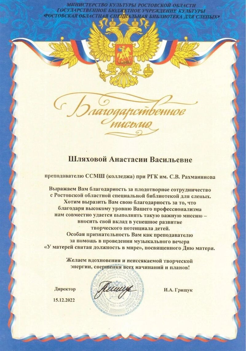 - Министерство культуры Ростовской области, государственное бюджетное учреждение культуры «Ростовская областная специальная библиотека для слепых», благодарственное письмо за плодотворное сотрудничество специальной библиотекой для слепых, 2022 г.
