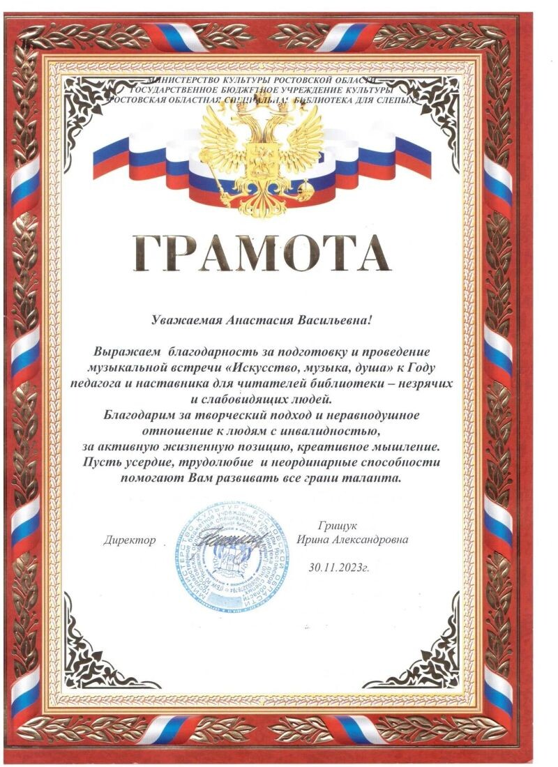 - Министерство культуры ростовской области государственное бюджетное учреждение культуры «Ростовская областная специальная библиотека для слепых», благодарность за подготовку и проведение музыкальной встречи «Искусство, музыка, душа», 2023 г.