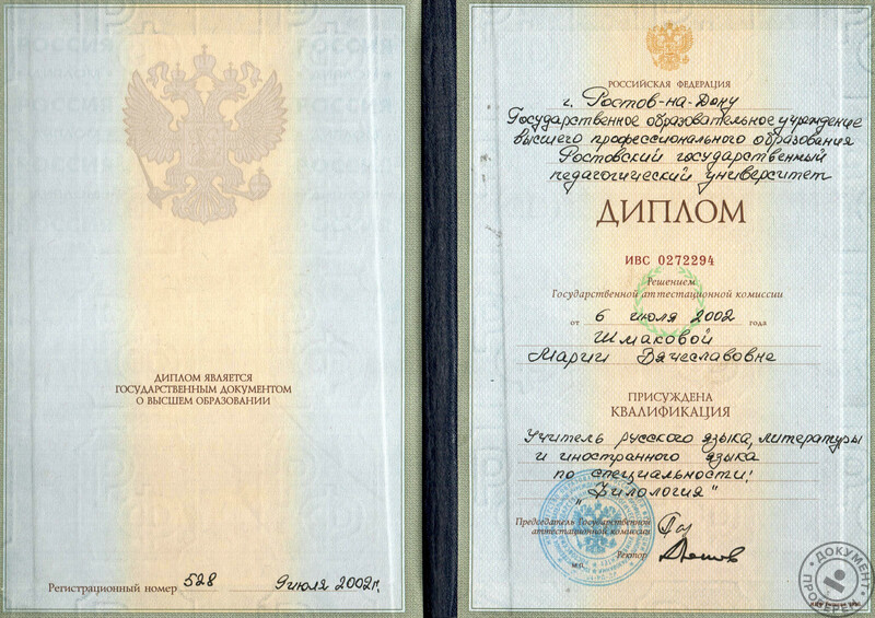 - Ростовский государственный педагогический университет, факультет славянской и западноевропейской филологии, специальность – преподаватель английского, русского языков, литературы, 2002 г.