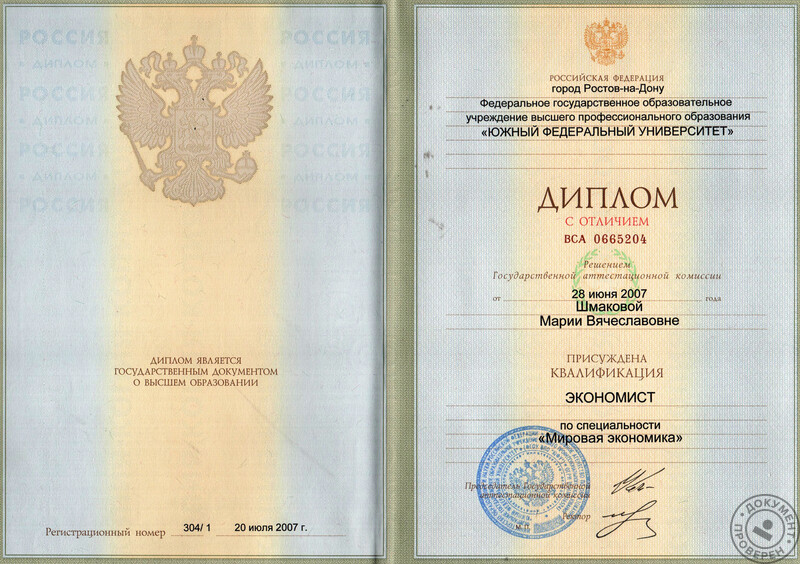 - Ростовский государственный университет, факультет мировой экономики, специальность – экономист, диплом с отличием, 2007 г.