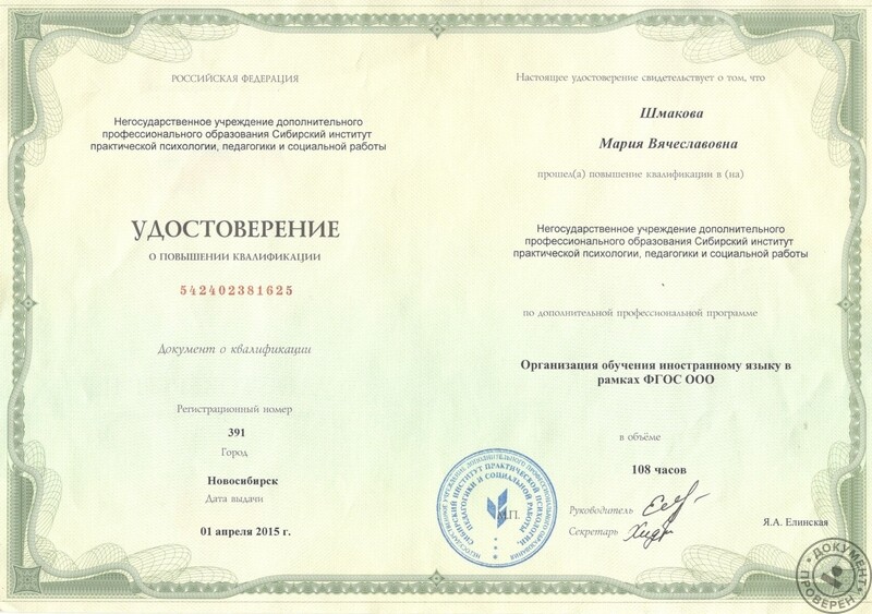 - Повышение квалификации «Организация обучения иностранному языку в рамках ФГОС ООО», 2015 г.