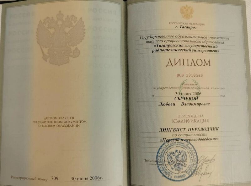 - Таганрогский государственный университет, факультет лингвистического образования, специальность перевод и переводоведение, 2000–2006 гг.