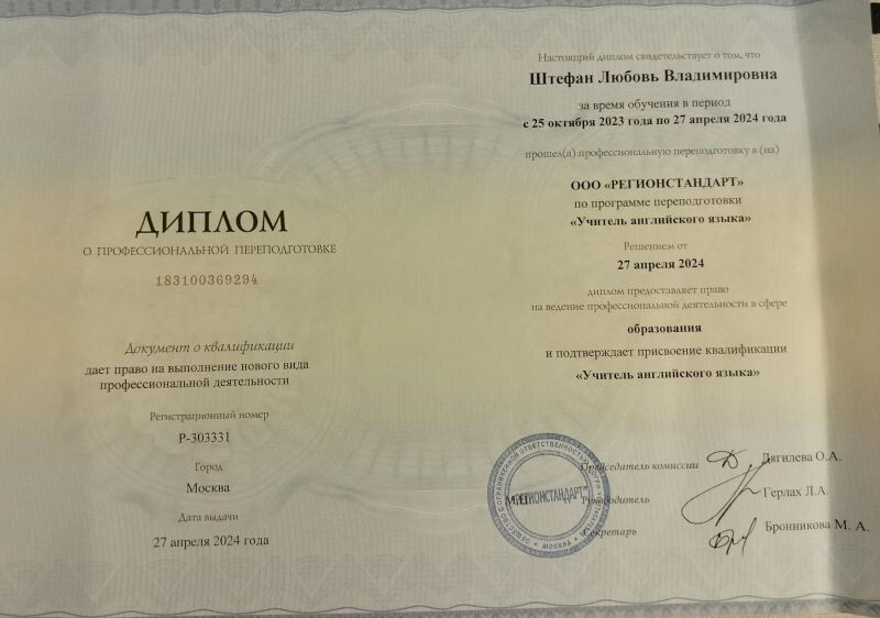 - Программа профессиональной переподготовки ООО "Регионстандарт" по программе переподготовки "учитель английского языка", 2023–2024 гг.