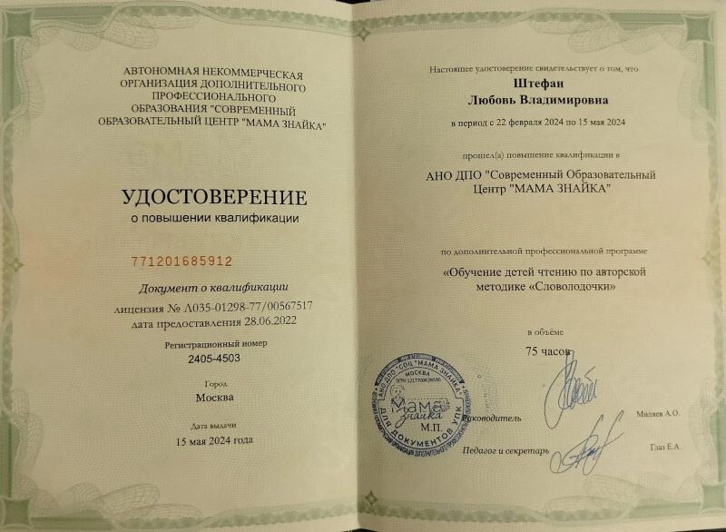 - АНО ДПО "Современный Образовательный Центр "МАМА ЗНАЙКА" по дополнительной профессиональной программе "Обучение детей чтению по авторской методике " Словолодочки", 2024 г.