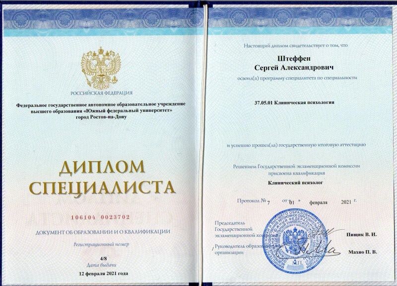 - Южный Федеральный Университет, Клиническая психология, 2015–2021 гг.