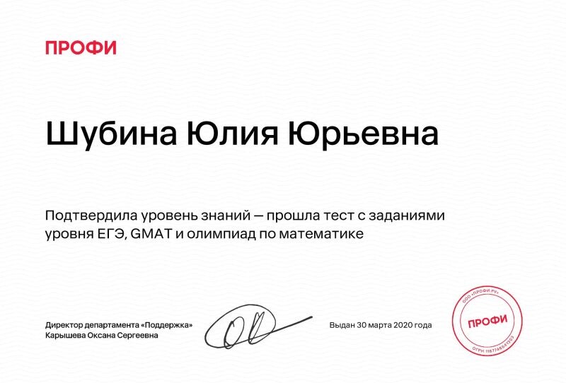 - Подтвердила уровень знаний — Прошла тест с заданиями уровня ЕГЭ, GMAT и олимпиад по математике (с 2020 г.).