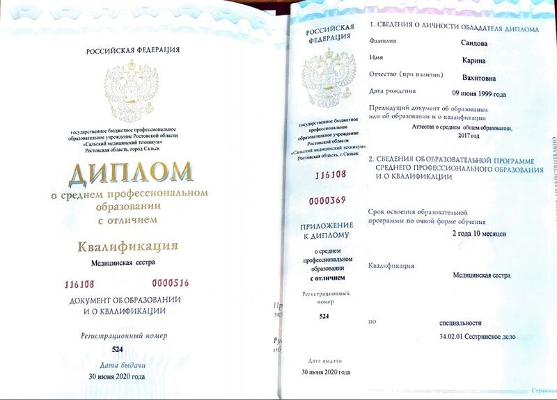 - ГБПОУ РО Сальский медицинский техникум, медицинская сестра, 2017–2020 гг.