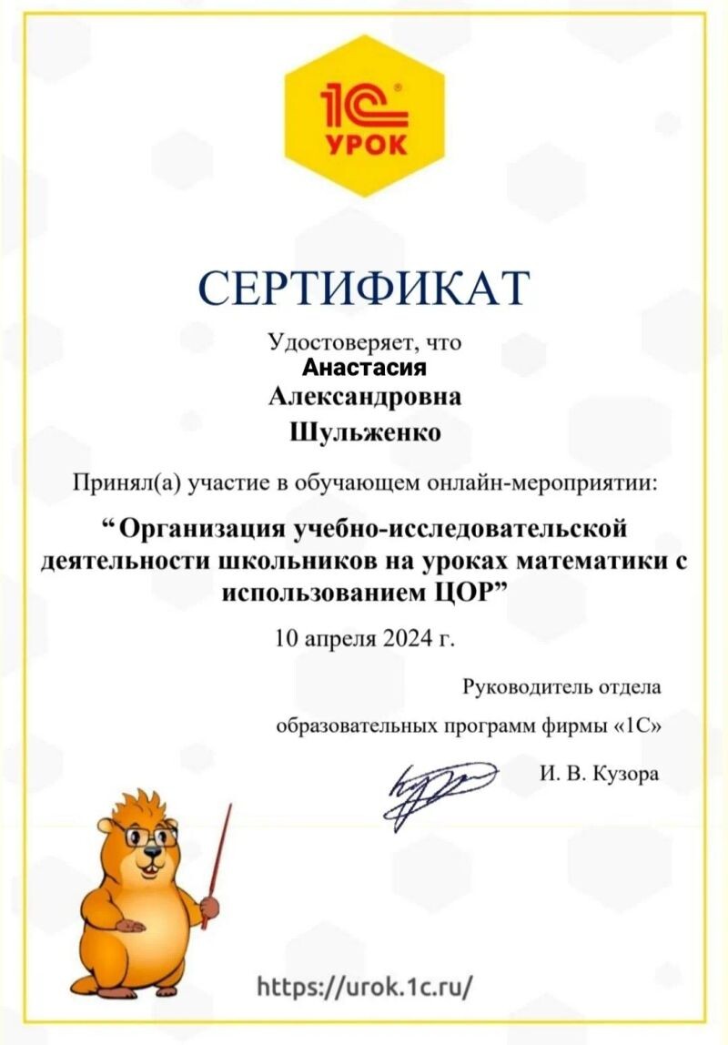 - Образовательная программа фирмы «1С», онлайн-курс «Организация учебно-исследовательской деятельности школьников на уроках математики с использованием ЦОР», 2024 г.