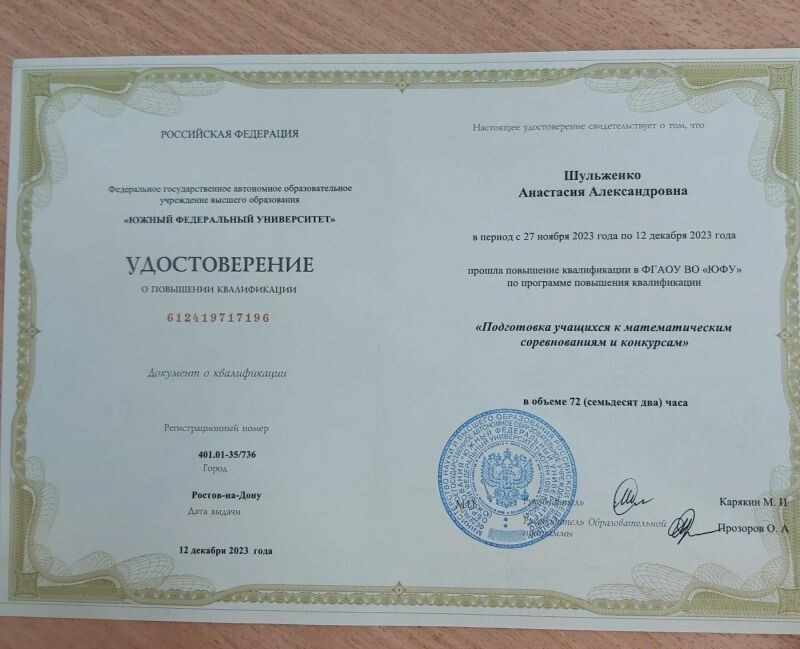 - ФГАОУ ВО «Южный федеральный университет», повышение квалификации по дополнительной профессиональной программе «Подготовка учащихся к математическим соревнованиям и конкурсам», 2023 г.
