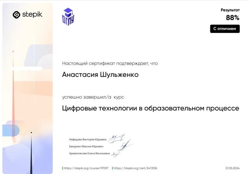 - Stepik, курс «Цифровые технологии в образовательном процессей», 2024 г.