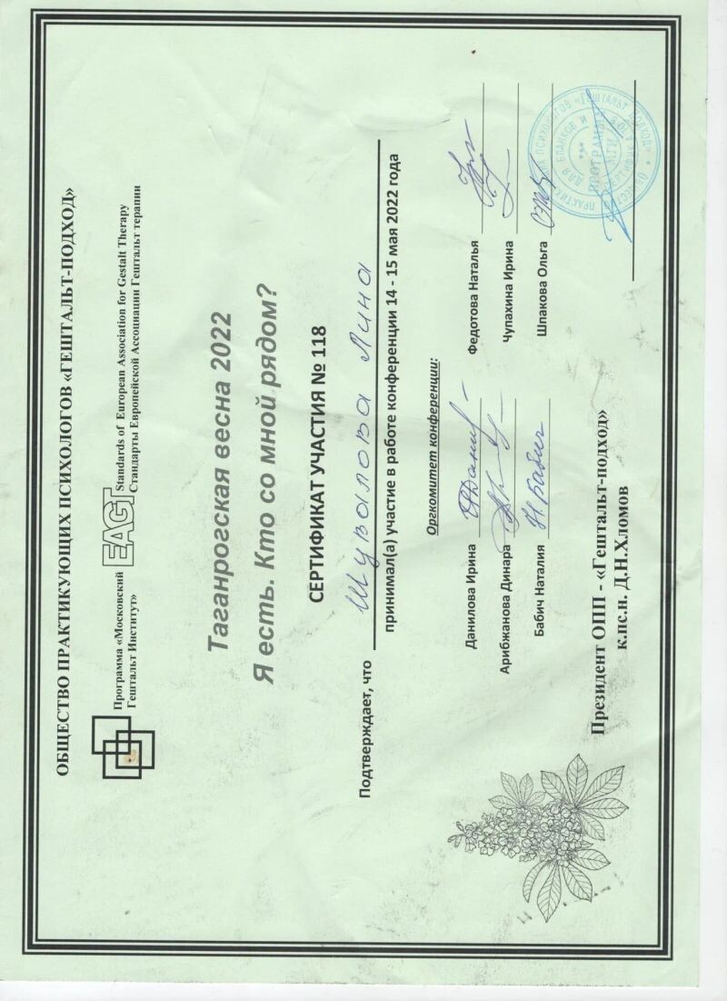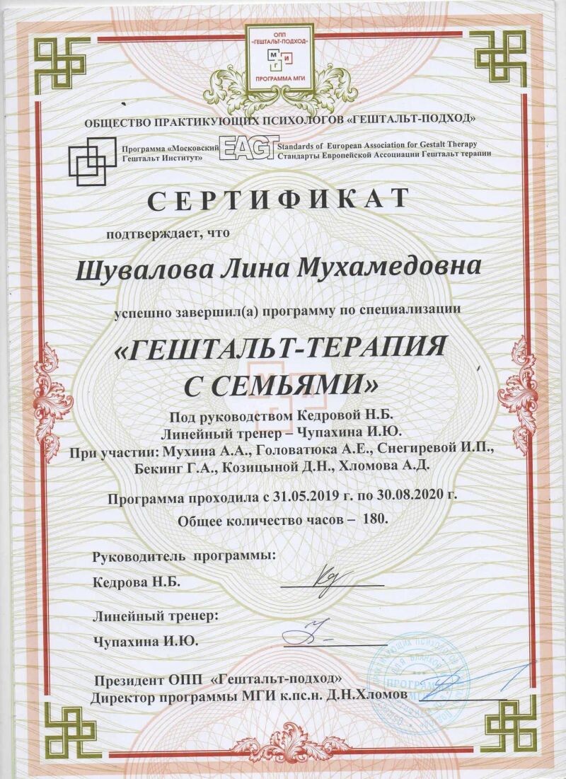 - Московский Гештальт Институт, Гештальт, 180 часов, 2019–2020 гг.