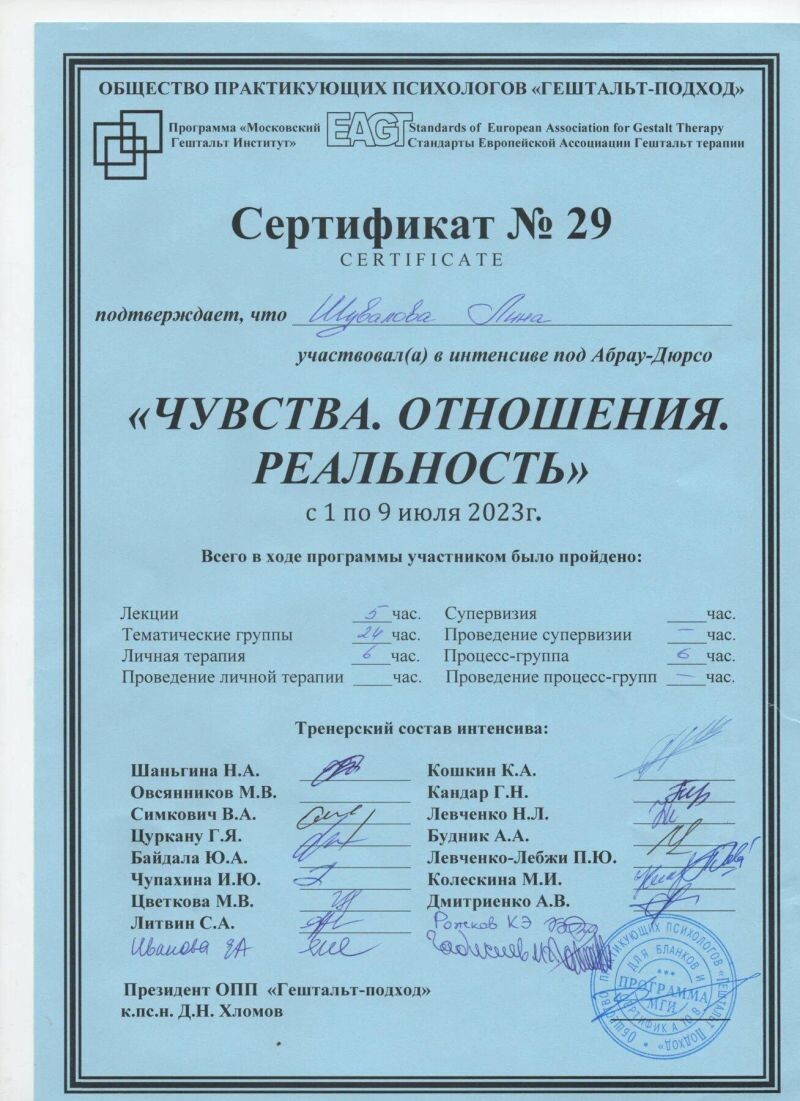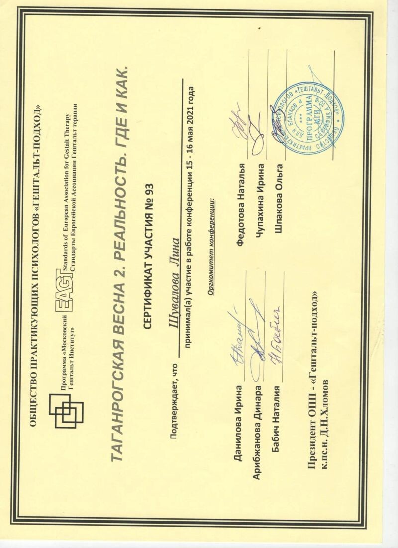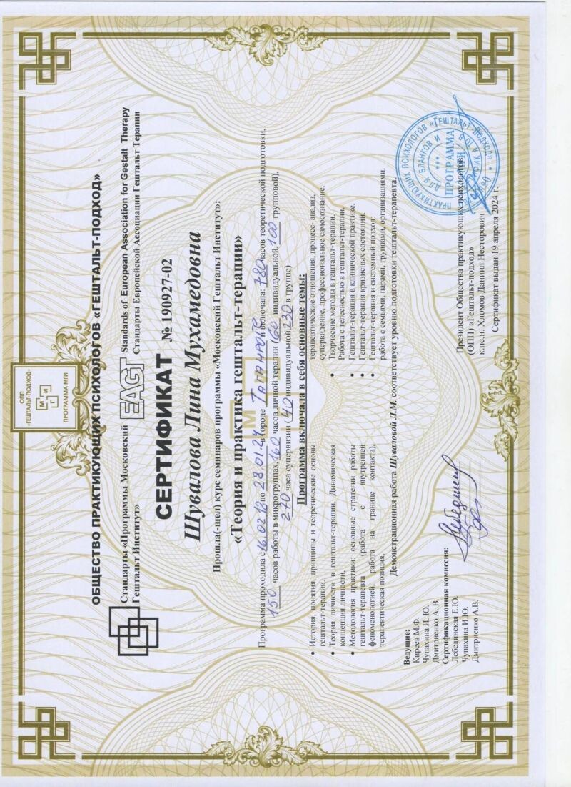 - Московский гештальт институт, теория и практика гештальт-терапии, гештальт-терапевт, 2018–2024 гг.