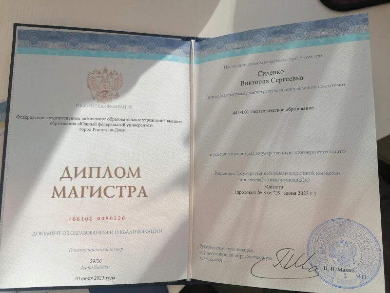 - Южный федеральный университет, педагогическое образование, 2021–2023 гг.
