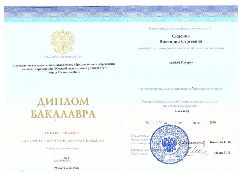 - Южный федеральный университет, история, бакалавр, 2016–2020 гг.