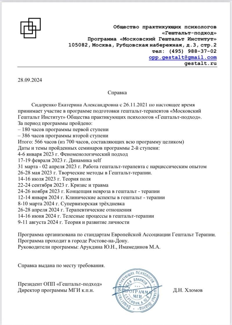 - Общество практикующих психологов «Гештальт-подход», справка об участие в программе подготовки гештальт-терапевтов «Московский Гештальт Институт» (с 2024 г.).
