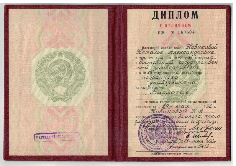 - Ростовский государственный университет, биология, биолог, преподаватель биологии и химии, 1991–1996 гг.