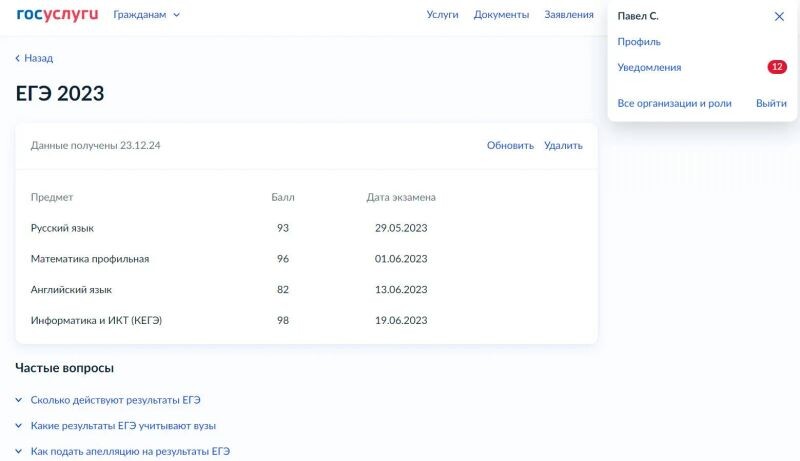 - ЕГЭ по информатике — 98 баллов, ЕГЭ по профильной математике — 96 баллов, ЕГЭ по русскому языку — 93 балла, 2023 г.