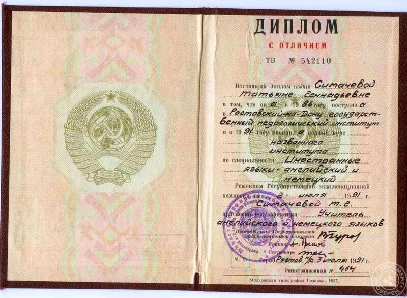 - С отличием окончила факультет иностранных языков Ростовского государственного педагогического университета, квалификация – учитель английского и немецкого языков, 1991 г.