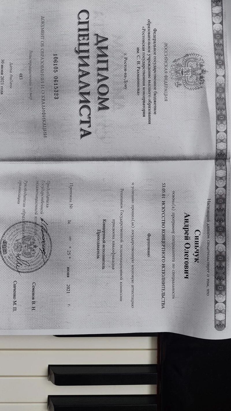 - Ростовская государственная консерватория им. С.В. Рахманинова, квалификация «концертный исполнитель, преподаватель», 2016–2021 гг.