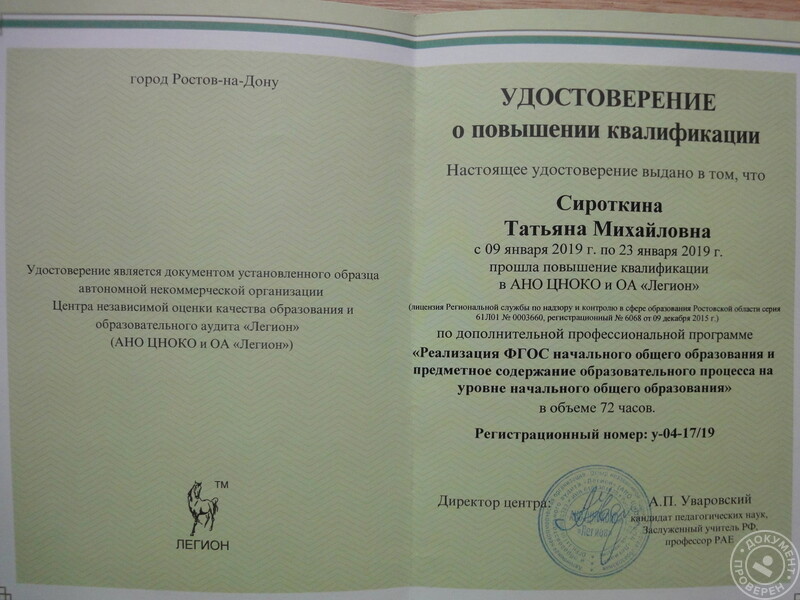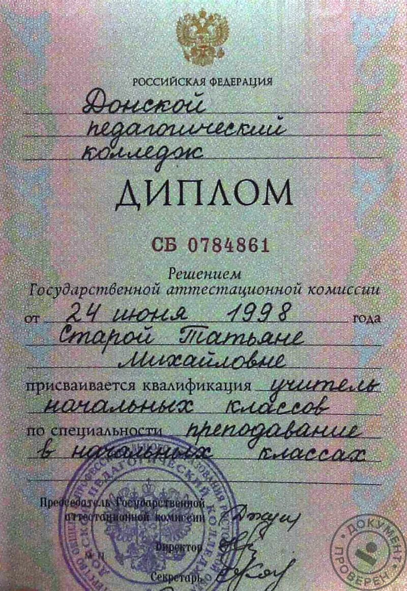 - Донской педагогический колледж, специальность – учитель начальных классов, 1998 год.