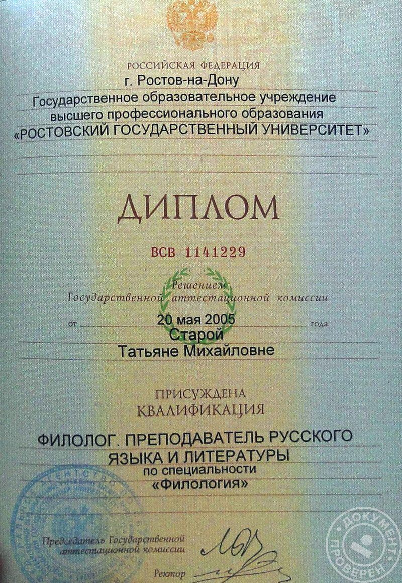- Ростовский государственный университет, факультет филологии и журналистики, специальность – филология, преподаватель русского языка и литературы, 2005 год.