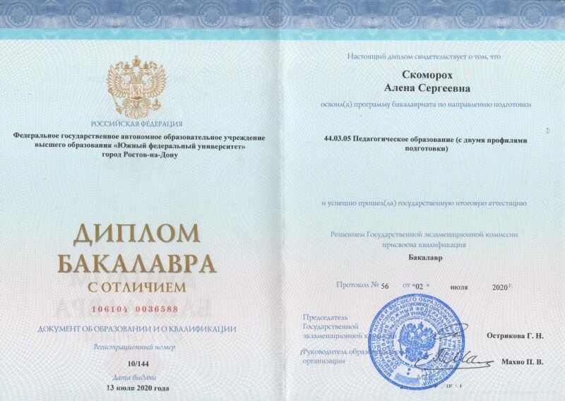 - ЮФУ, педагогическое образование (с двумя профилями подготовки), бакалавр с отличием, 2020 г.