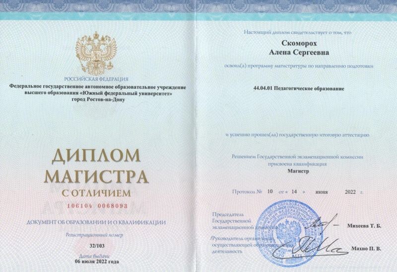 - ЮФУ, педагогические образование, магистр с отличием, 2020–2022 гг.