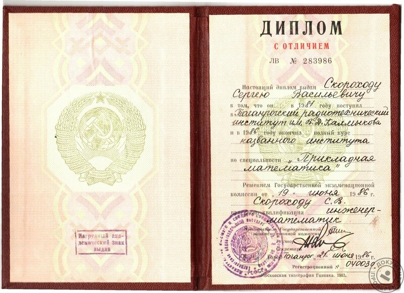 - Окончил Тагарогский радиотехнический институт, факультет автоматики и вычислительной техники, специальность – прикладная математика, квалификация – инженер-математик, диплом с отличием, 1986 г.