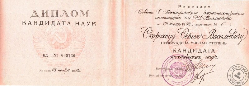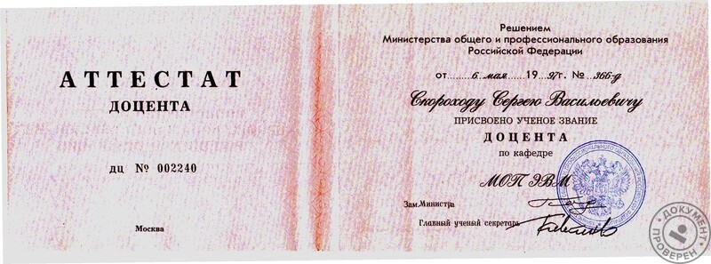 - Ученое звание доцента по кафедре МОП ЭВМ, 1997 г.