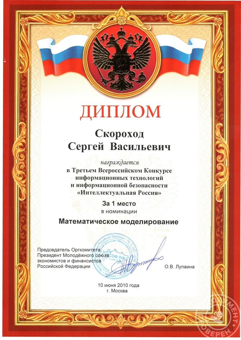 - Победитель III Всероссийского конкурса информационных технологий и информационной безопасности «Интеллектуальная Россия» в номинации «Математическое моделирование», 2010 г.