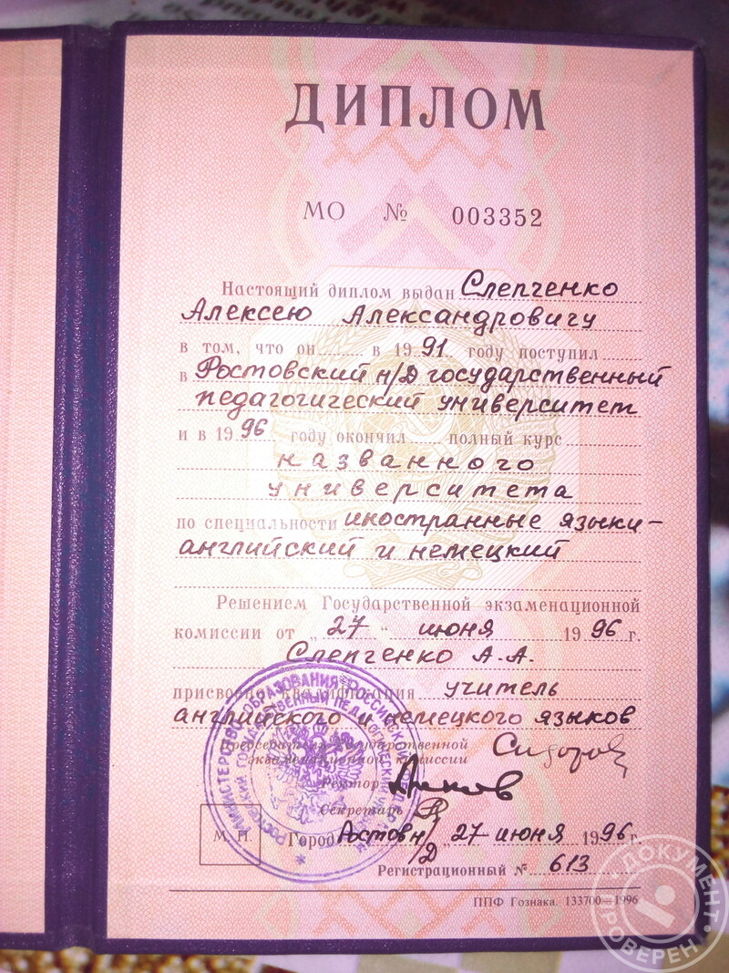 - Ростовский-на-Дону государственный педагогический университет, факультет иностранных языков, квалификация – учитель английского и немецкого языков, 1996 г.