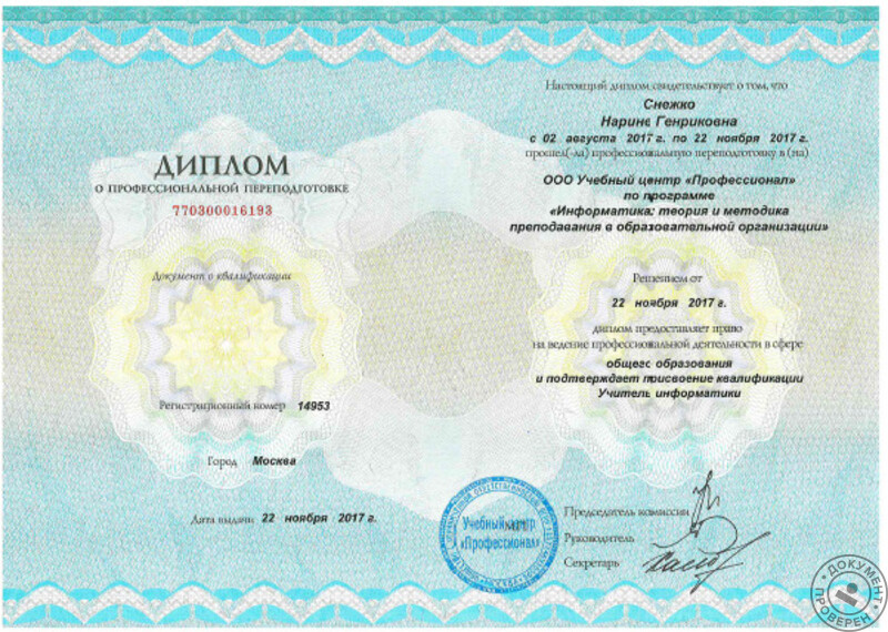 - Профессиональная переподготовка в учебном центре «Профессионал» по программе «Информатика: теория и методика преподавания в образовательной организации», 2017 г.