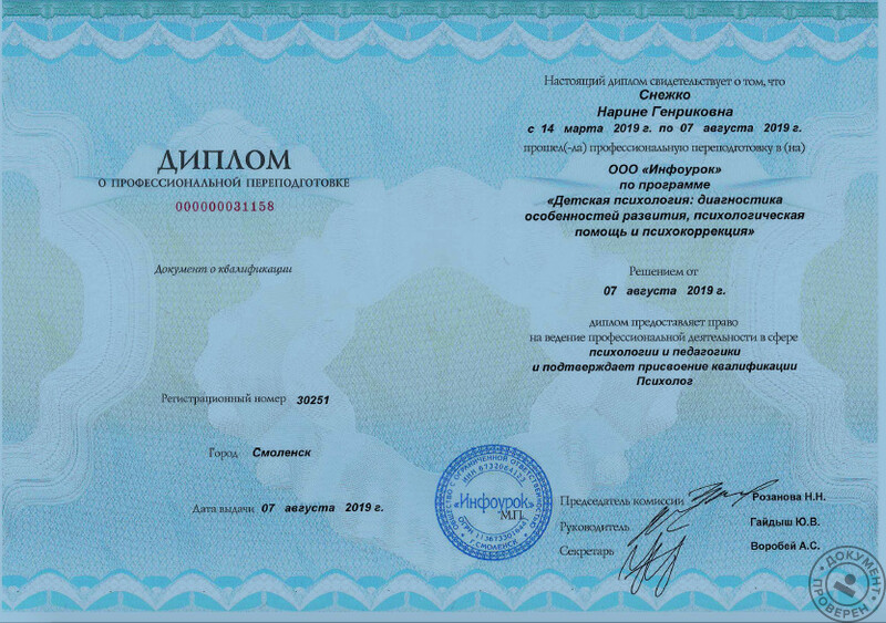 - Курсы повышения квалификации по программе «Детская психология: диагностика особенностей развития, психологическая помощь и психокоррекция», 2019 г.