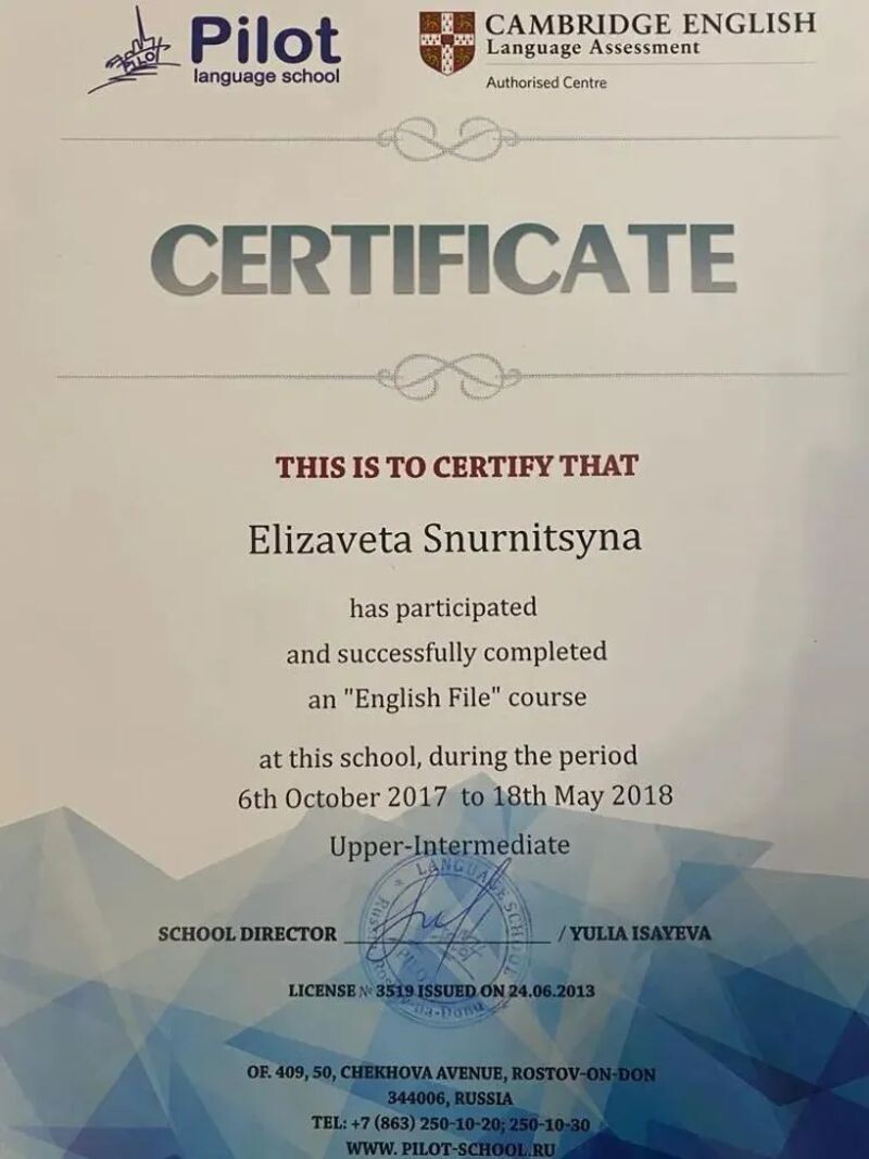- Pilot. cертификаты на знание английского на уровне B2 (Upper-Intermediate), C1 (Advanced), 2018 г.