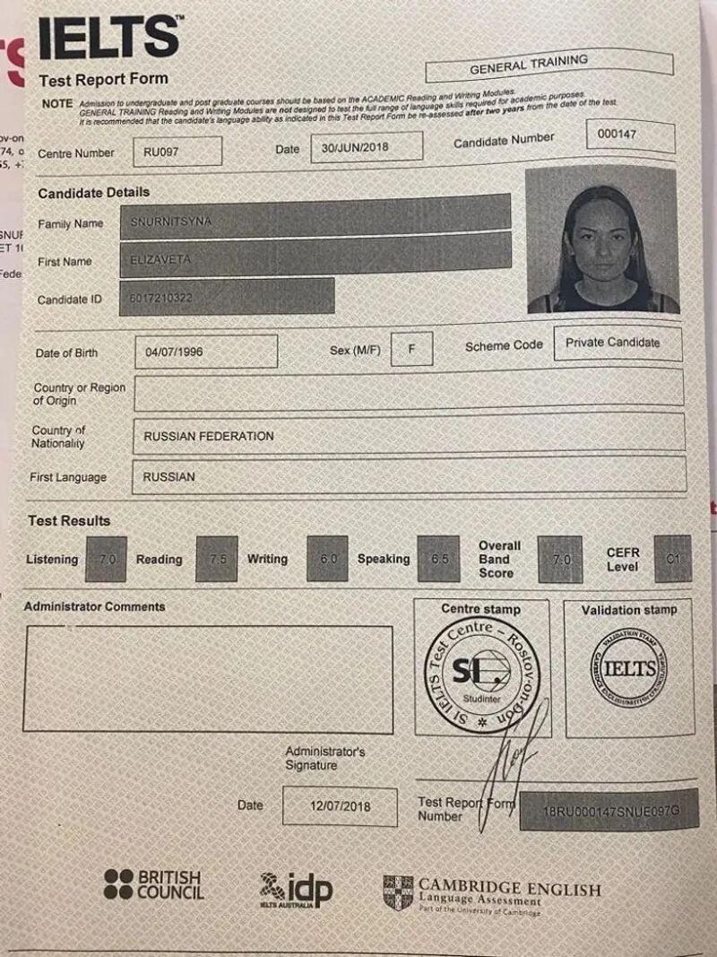 - Test Report Form. cертификат IELTS 7.0, 2018 г.
