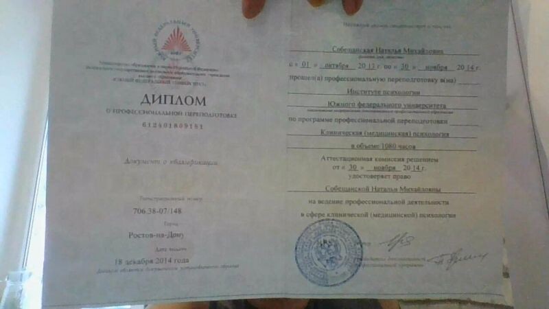 - Институт психологии Южного федерального университета, программа «Клиническая (медицинская) психология», 2013–2014 гг.