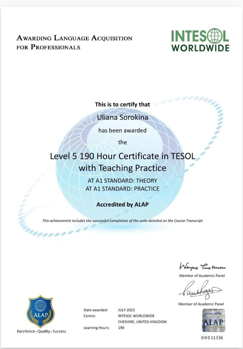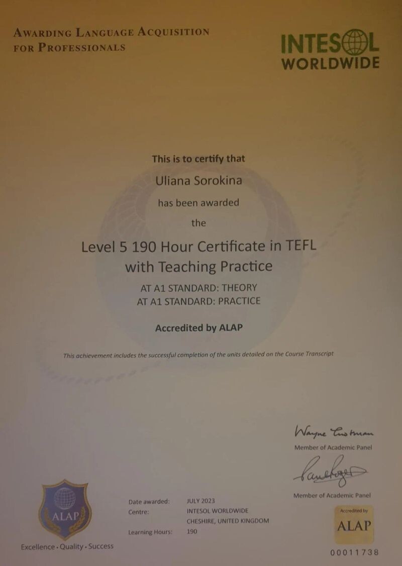 - Certificate TEFL with Teaching Practice, 2023 г.