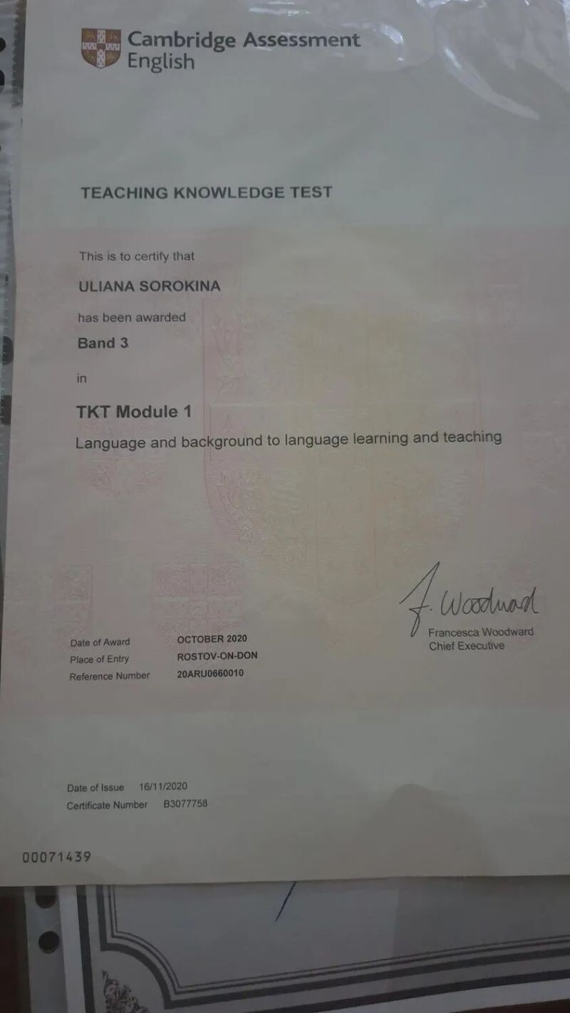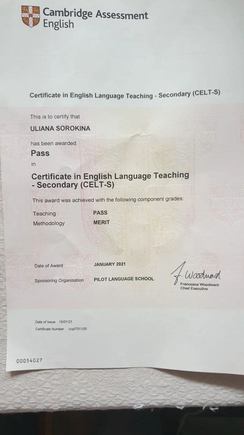 - Certificate in English Language Teaching Secondary (CELT-S) Cambridge Assessment English, 2021 г.